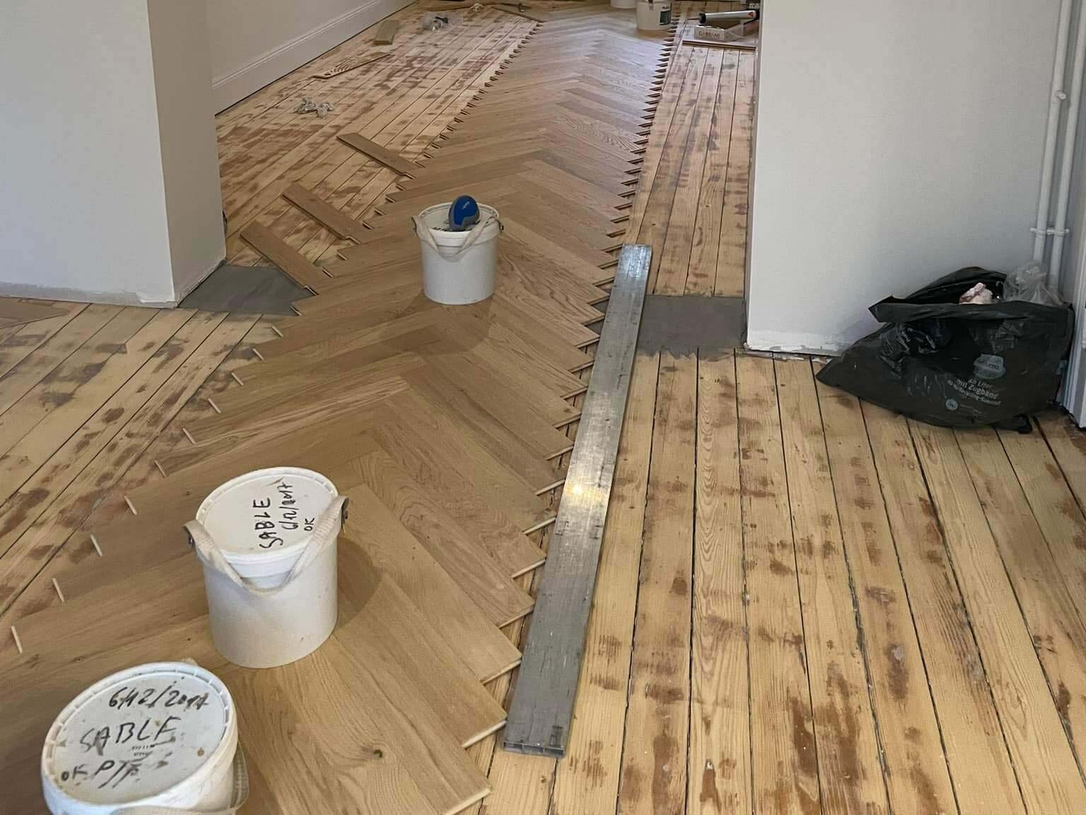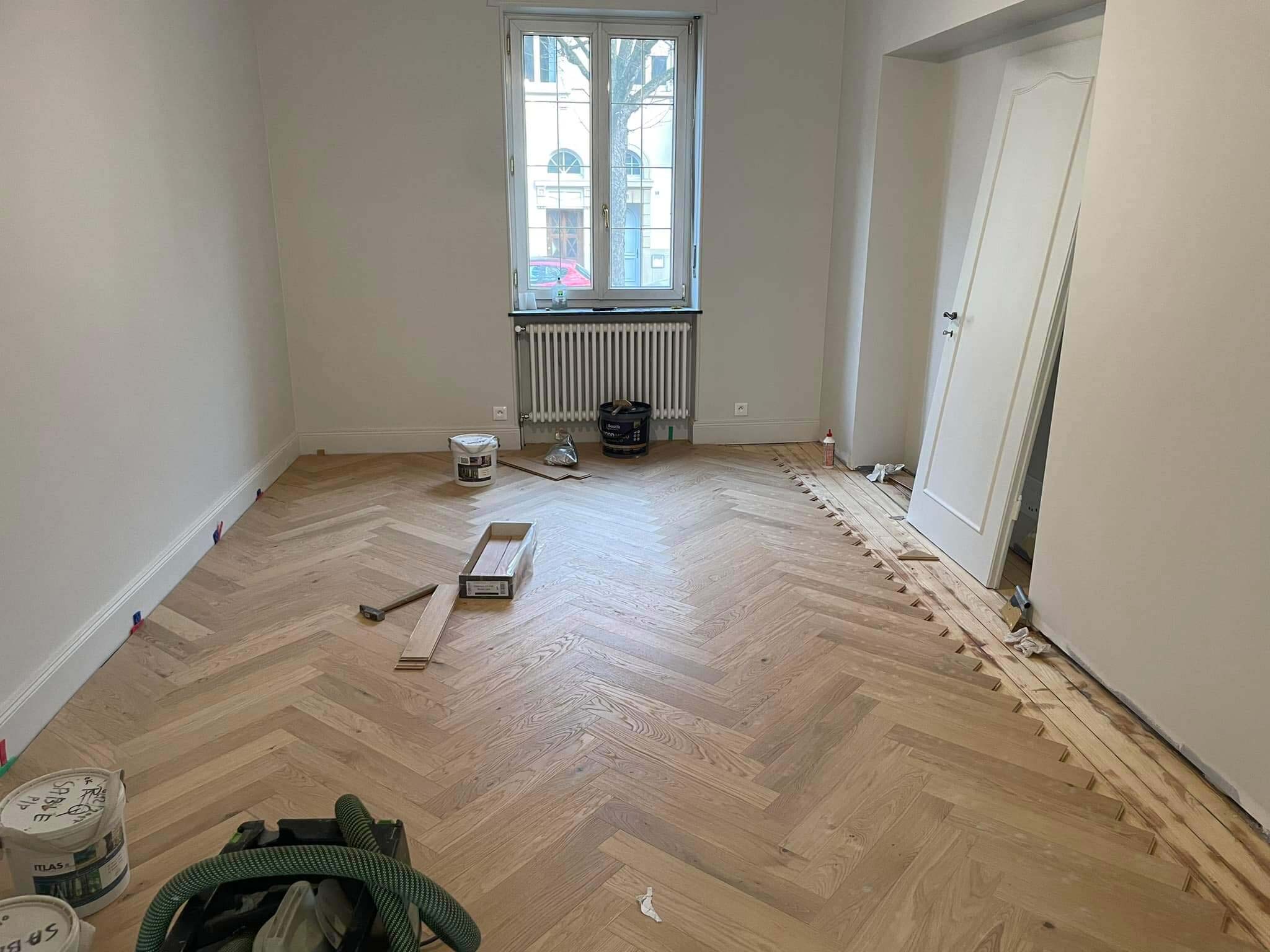 Pose de parquet en bois massif à bâtons rompus dans un appartement à Strasbourg dans le Bas-Rhin